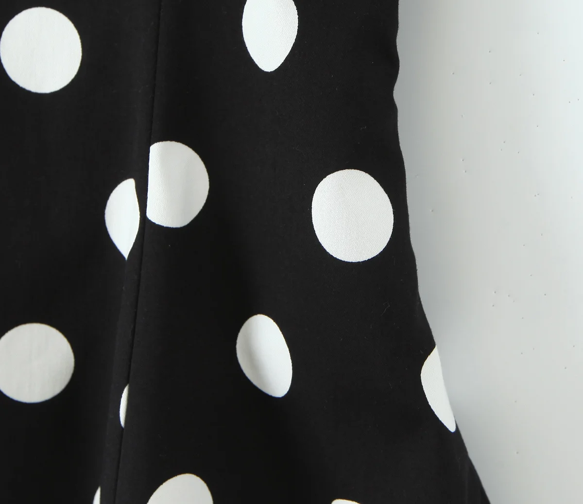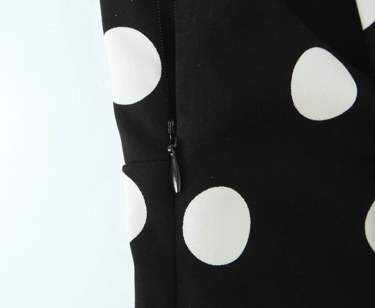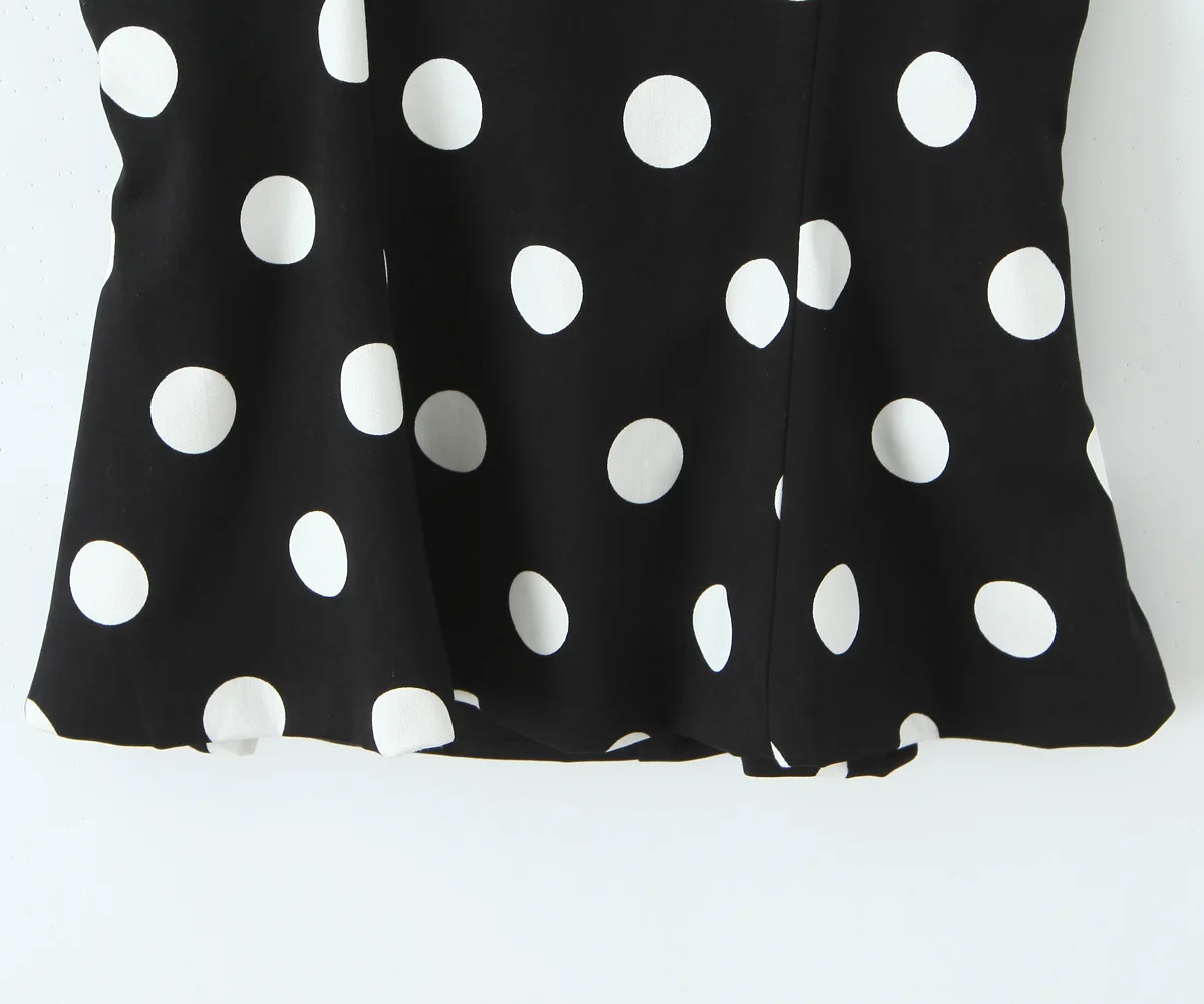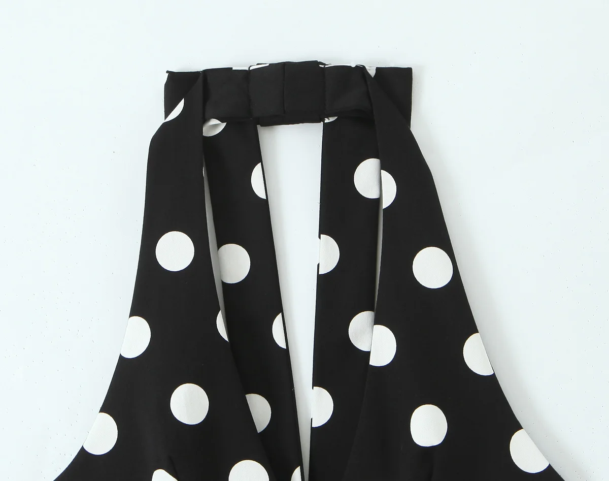 Polka dot top with a deep halter neckline and tie closure at the neck. Fitted design with strategic cutouts and invisible side zipper closure.